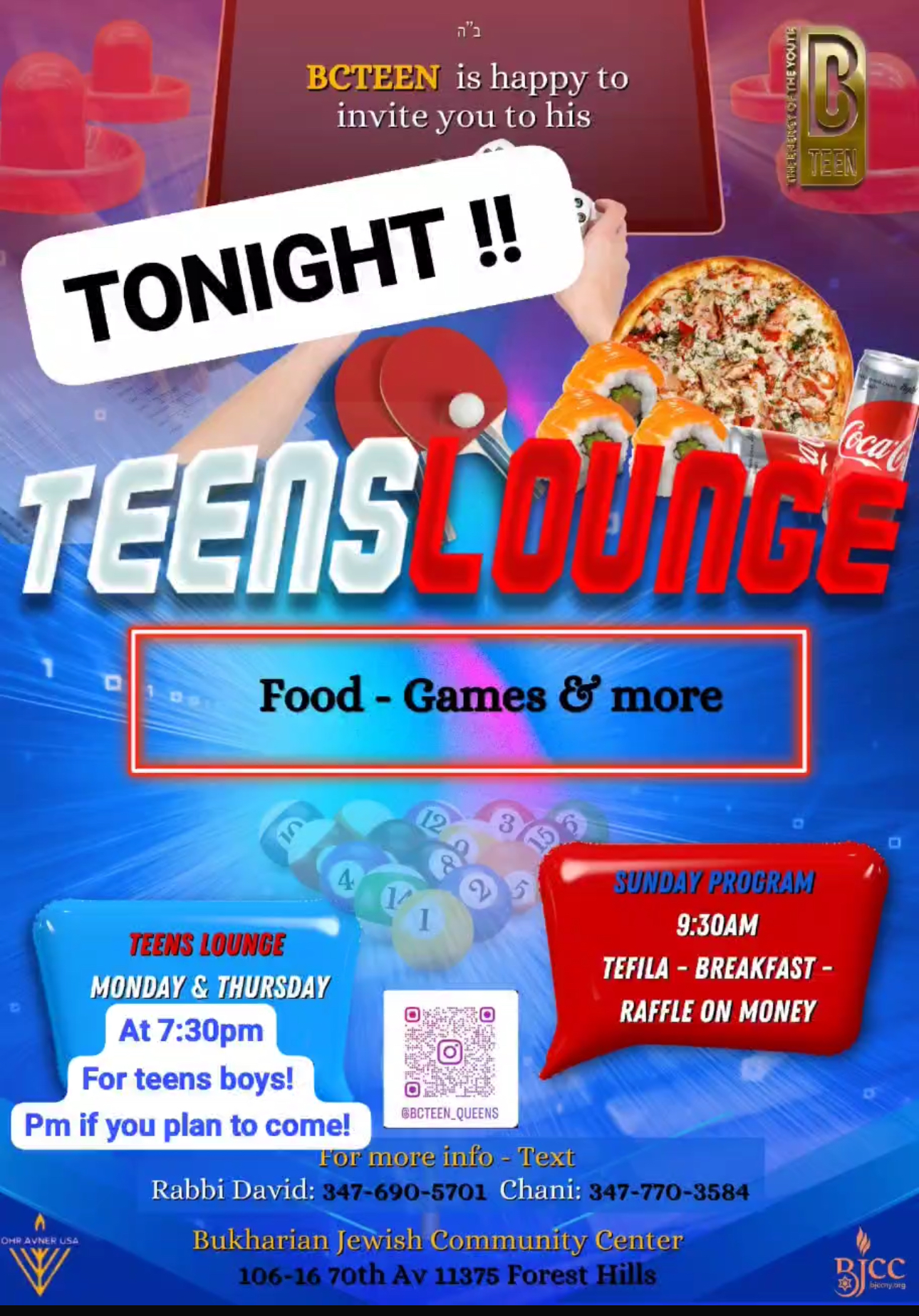 BCTeen is hosting a Teens Lounge event at the Bukharian Jewish Community Center. Teen boys can come for food, games, and a fun hangout. The program starts at 7:30 PM on Monday and Thursday, and there’s a Sunday program at 9:30 AM with tefila, breakfast, and a money raffle. If you plan to join, send a message. For details, contact Rabbi David at 347-690-5701 or Chani at 347-770-3584..