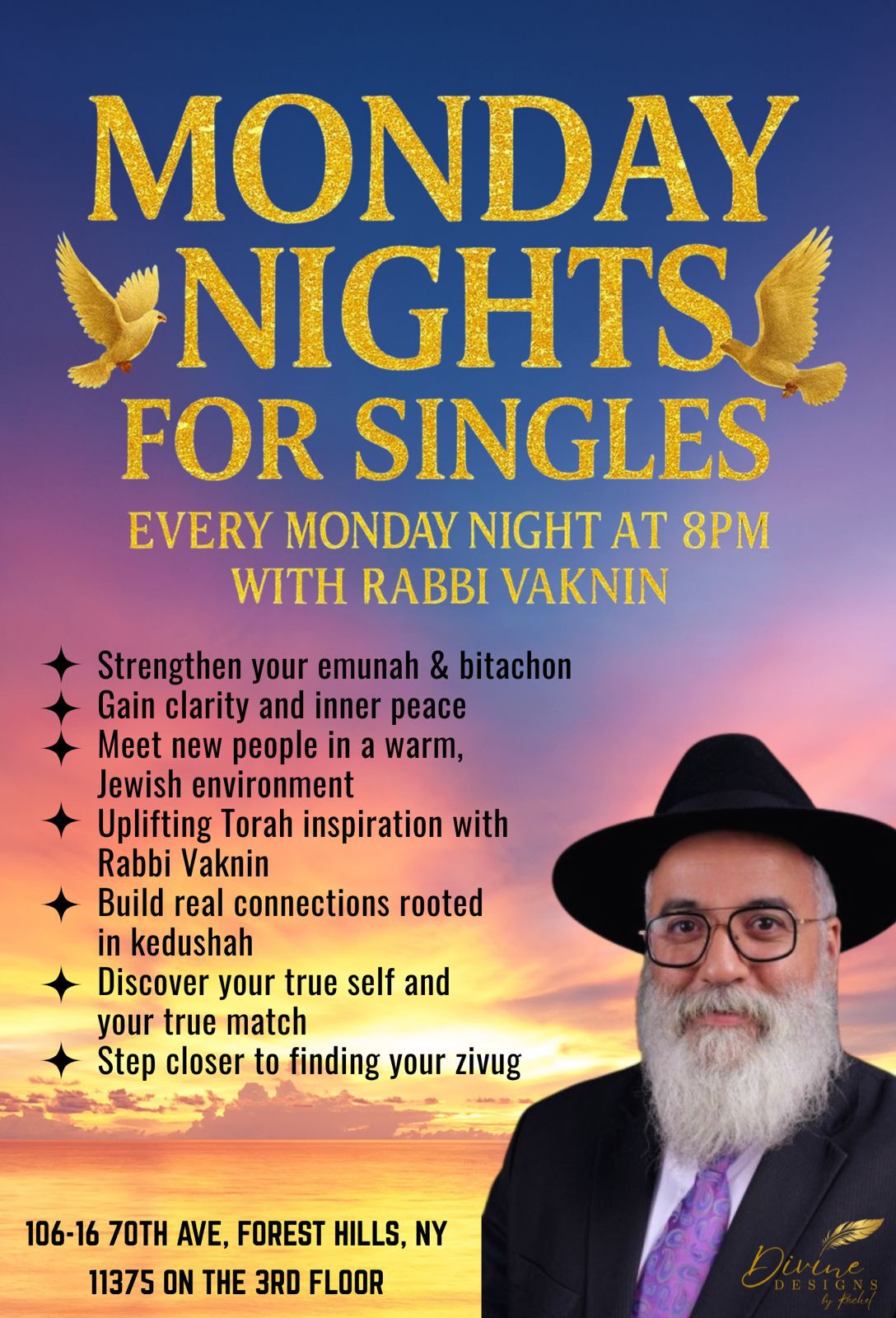 Monday Nights for Singles - every Monday at 8pm with Rabbi Vaknin
